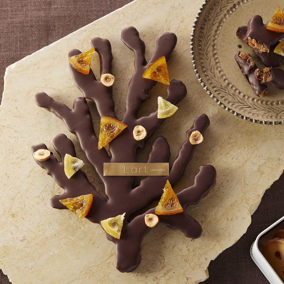 それにコンフィやミルクチョコレートを合わせて1本ずつ枝を描くように絞り出し、外側をダークチョコレートでコーティングした、まるで木の枝のようなシェフ土谷のオリジナルチョコレート菓子。(全長30cm)