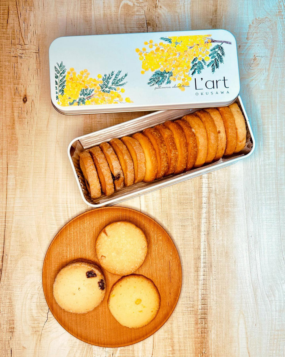 シェフがフランス滞在中に南仏で見たミモザの花をあしらったクッキー缶。