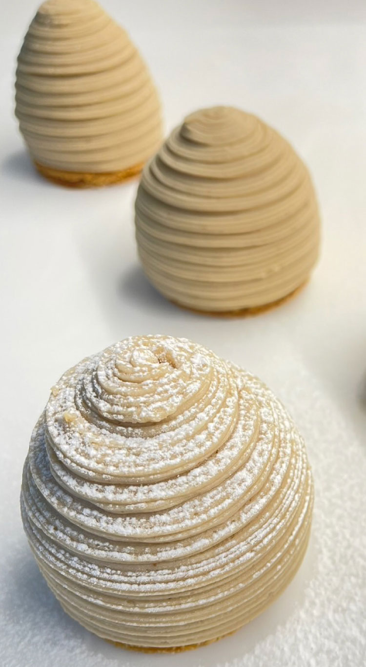 この「大枝」に使うのは、深めにキャラメリゼし、粗挽きでキャラメルの食感を残したヘーゼルナッツのプラリネ。